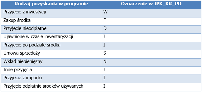 Dane dotyczące nabycia/wytworzenia środka trwałego pobierane są z dokumentów Przyjęcie środka trwałego OT. Na podstawie wartości pola Rodzaj pozyskania przypisywane jest odpowiednie oznaczenie zgodne ze strukturą logiczna pliku JPK_ST_KR.