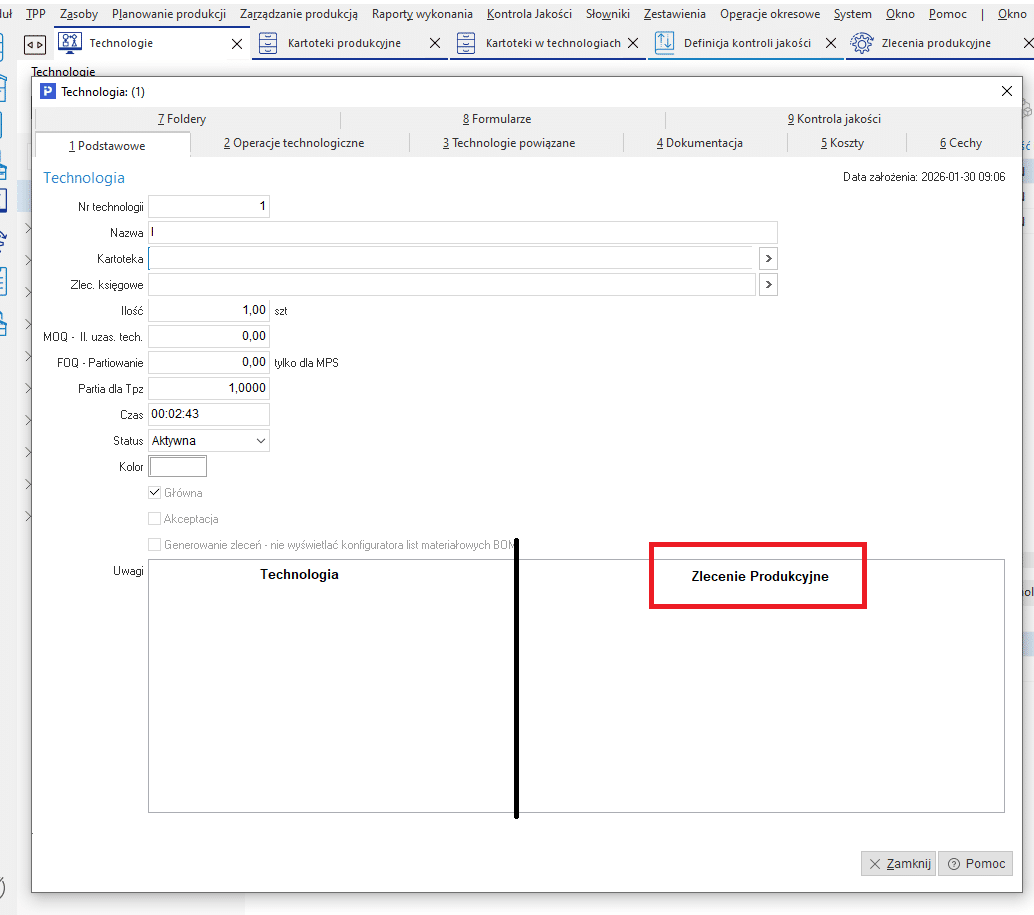 Przydatne byłoby drugie podobne okno w Technologiach – „Uwagi Zlecenia” – które przenosiłby się na zlecenie produkcyjne podczas jego wypuszczania jako stałe uwagi.