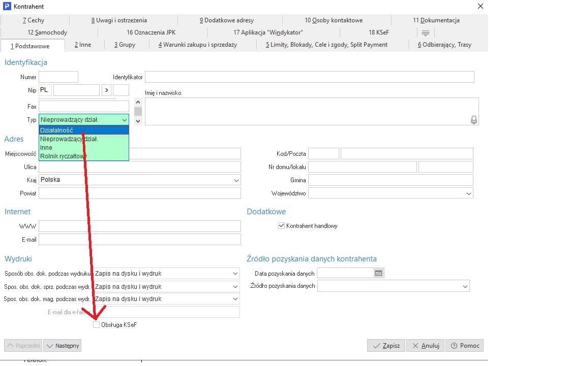 Obecnie zakładając nowego kontrahenta z nr NIP , wybieramy również Typ: Działalność i konieczne jest również zaznaczenie na samym dole okna pola z Obsługa KSeF.
