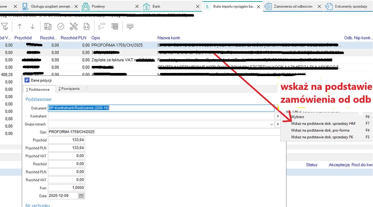 Dodanie w „Buforze importu wyciągów bankowych”- przy podciąganiu wpłaty – popraw – okno Dane pozycji -dodać opcję ” Wskaż na podstawie zamówienia”